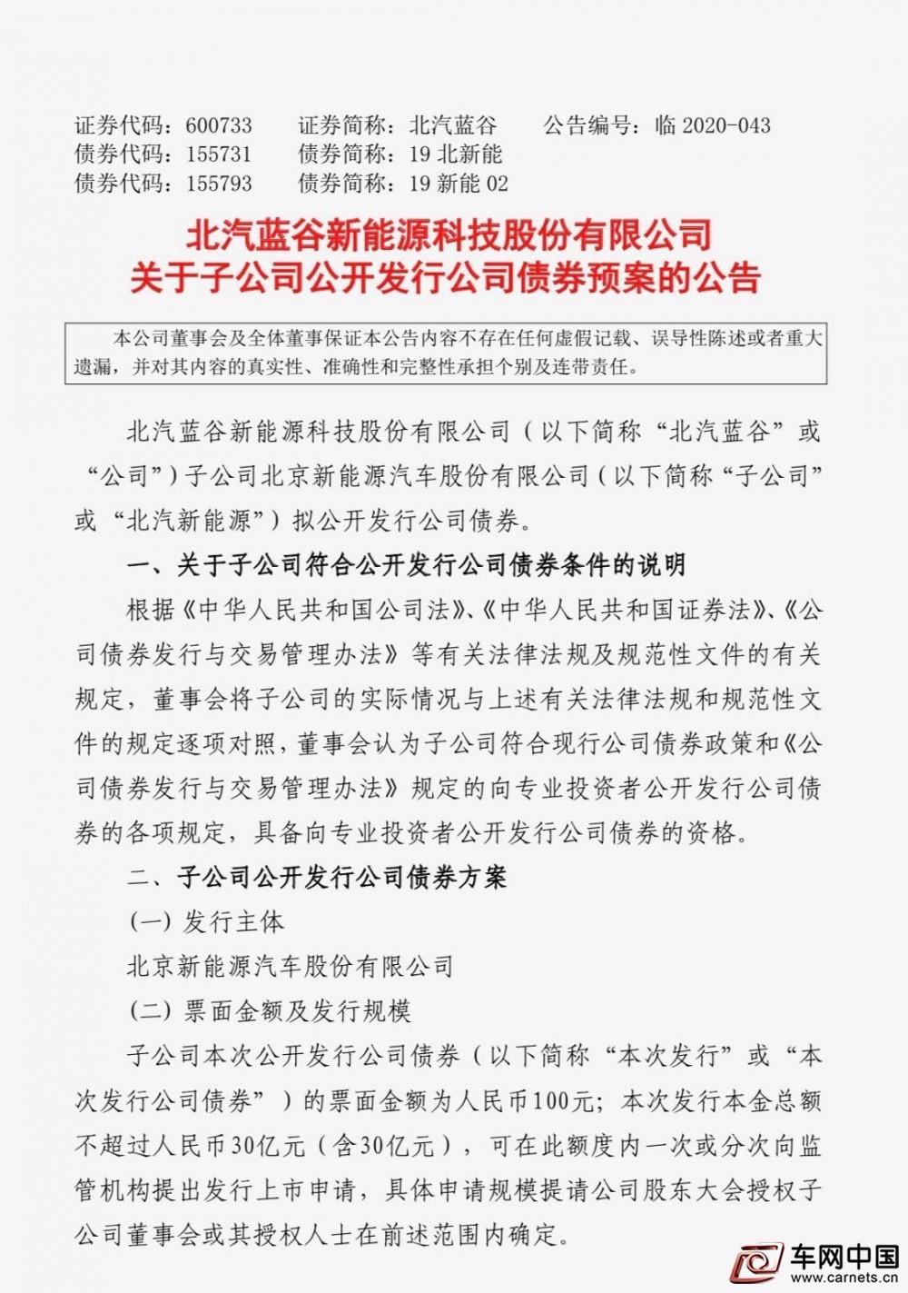 6月17日,北汽蓝谷发布公告,子公司北京新能源汽车股份有限公司(简称“北汽新能源”)拟公开发行不超过人民币30亿元(含30亿元)的公司债券。