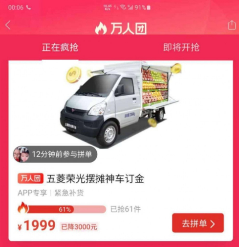 政策助推下,地摊经济受到高度关注,“摆摊”成为热议话题,同时也带火了五菱售货车。6月3日晚,拼多多宣布上线“五菱摆摊神车团”,首批上线共计100台,拼多多将为每台车补贴3000元油卡。消费者可通过拼多多秒杀频道、万人团等入口选购并享受补贴。