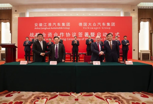 5月29日,江淮和大众汽车正式在北京签署合作协议。根据协议,大众汽车将在2020年12月31日之前通过增资方式获取江汽控股50%的股权。增资完成后,大众中国将成为江汽控股股东,持有江汽控股50%的股权,安徽省国资委持有江汽控股另外50%股权,仍是江汽控股实际控制人。