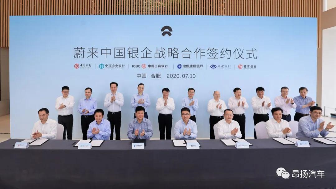 2020年7月10日上午,蔚来中国与中国建设银行安徽省分行等六家银行举行了蔚来中国银企战略合作签约仪式。