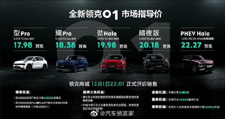 12月1日,领克汽车新全球高端SUV——全新领克01在杭州湾吉利汽车研究院上市,共计5款车型,售价17.98万元起。