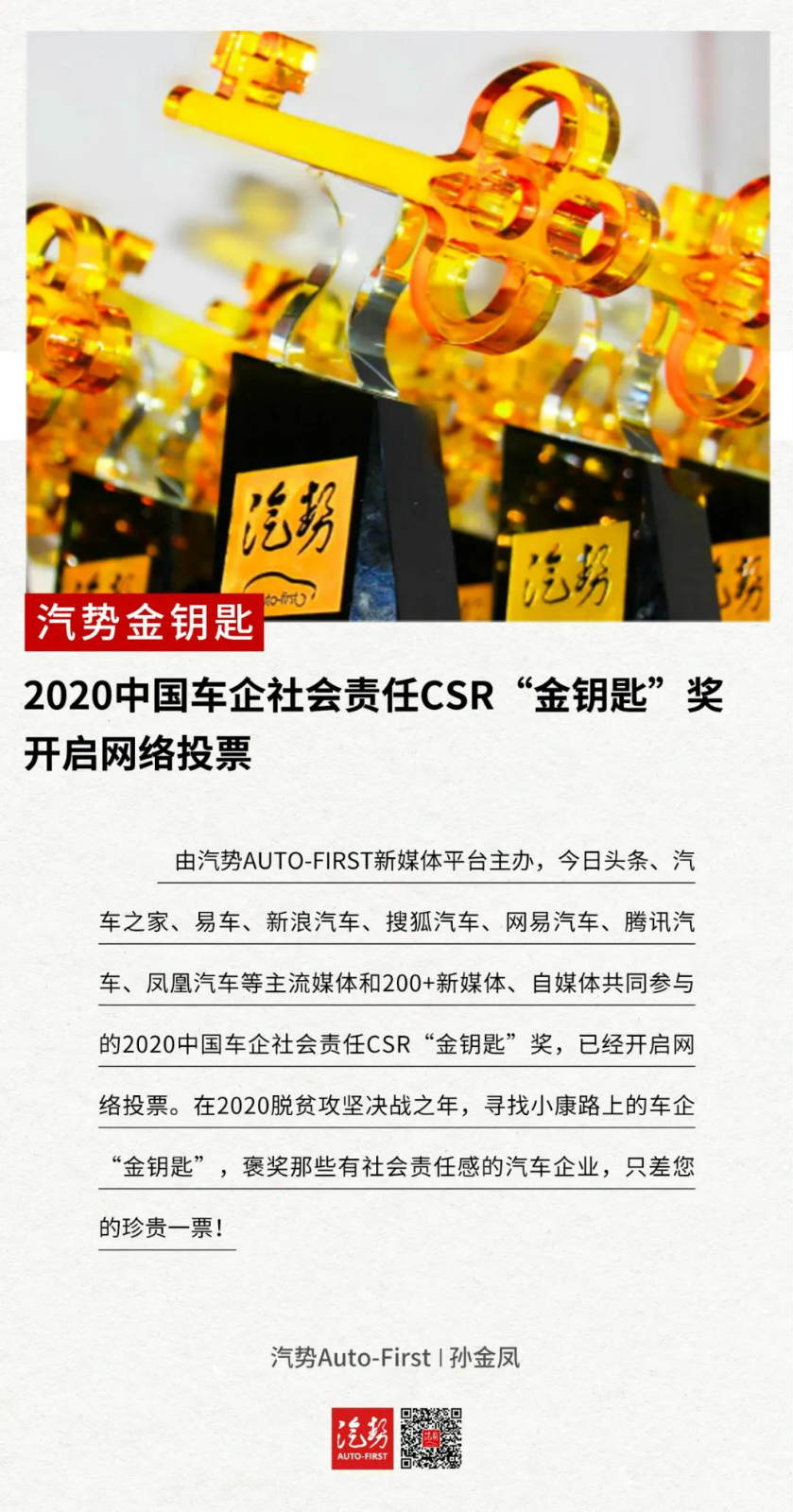 由汽势AUTO-FIRST新媒体平台主办,今日头条、汽车之家、易车、新浪汽车、搜狐汽车、网易汽车、腾讯汽车、凤凰汽车等主流媒体和200+新媒体、自媒体共同参与的2020中国车企社会责任CSR“金钥匙”奖,已经开启网络投票。在2020脱贫攻坚决战之年,寻找小康路上的车企“金钥匙”,褒奖那些有社会责任感的汽车企业,只差您的珍贵一票!