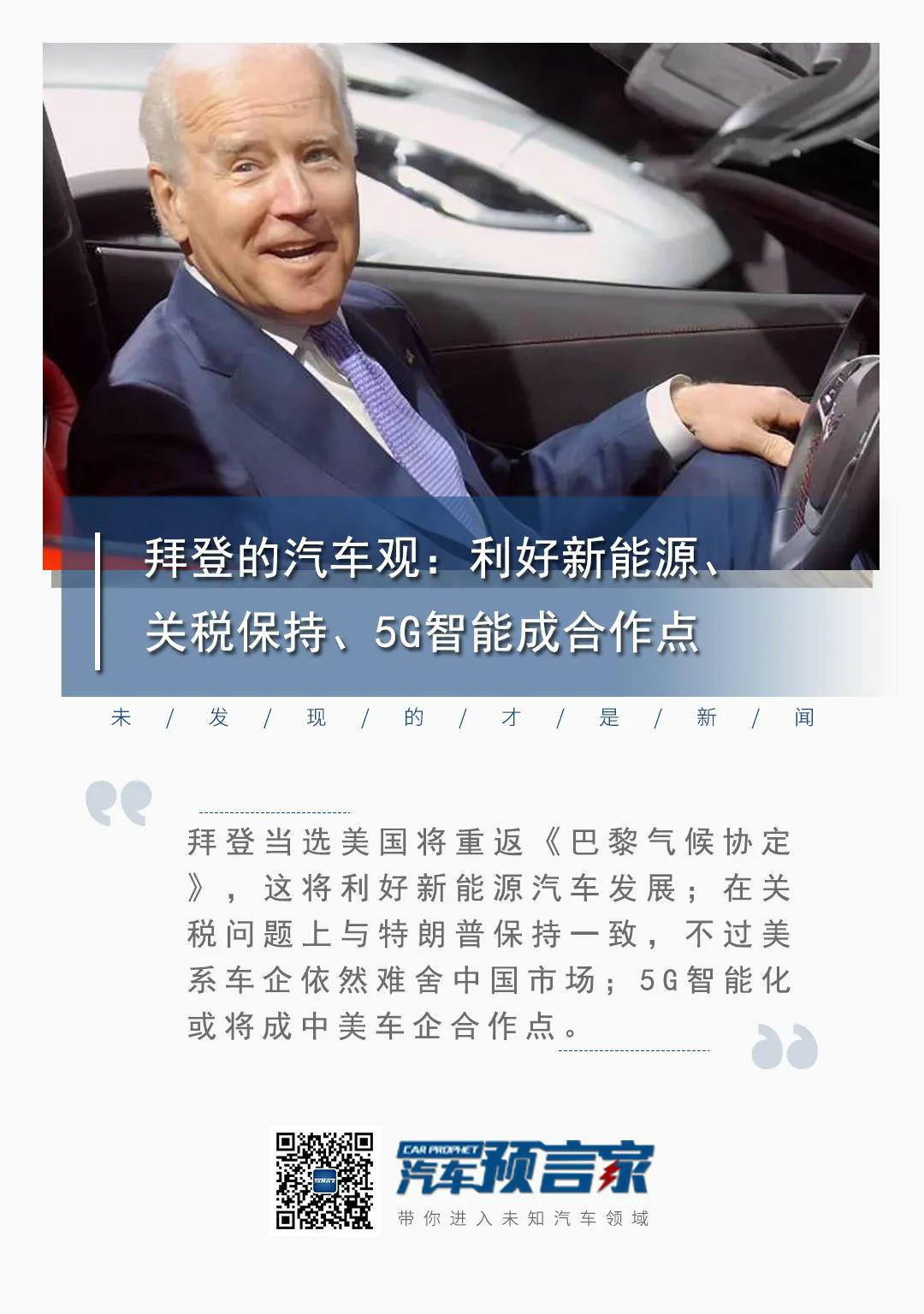 拜登当选美国将重返《巴黎气候协定》,这将利好新能源汽车发展;在关税问题上与特朗普保持一致,不过美系车企依然难舍中国市场;5G智能化或将成中美车企合作点。