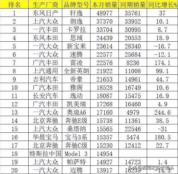六月乘用车销量排行:特斯拉首次挺进轿车20强