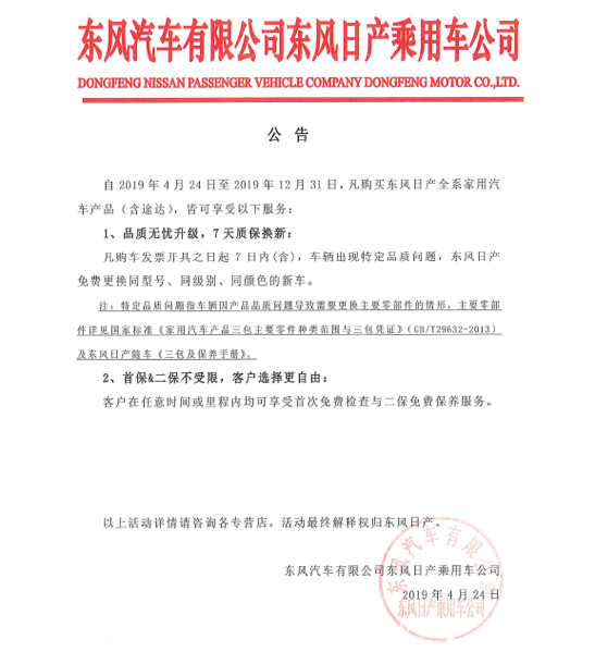 不过就在今天上午,关键性的破冰事件终于发生。4月24日上午10点,东风日产乘用车公司对外发布公告称,从2019年4月24日-2019年12月31日,凡购买东风日产全系家用汽车产品(含途达),均可在原有“三包”政策的基础上,额外享受“7天质保换新”及“首、二保不受限”服务。