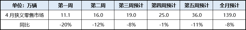 随着复工复产的推进以及物流恢复正常,大部分厂家开始恢复考核。但整体库存仍然较高,将不会出现销量的爆发式增长。据经销商调研,4月厂商目标同比下降8%,结合2019年调研样本量81%的总体市场占比, 可以初步推出4月狭义乘用车零售市场大数在139万辆左右,同比下滑约8% 。