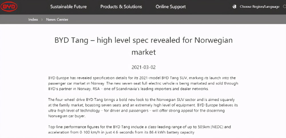 据比亚迪官方透露,唐EV将登录挪威市场。挪威版本的唐EV搭载86.4 kWh的刀片式磷酸铁锂电池,0-100km/h加速时间4.6秒,7座设计,面向家庭用户,外观设计将根据当地消费者的需求适当调整。唐EV能够打入欧洲市场,刀片电池功不可没。
