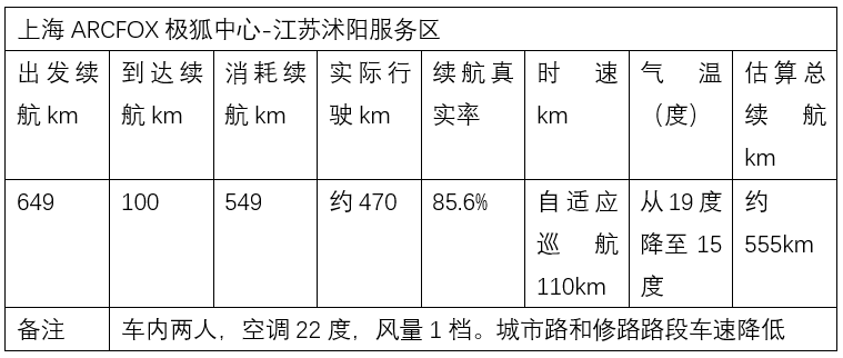 例如,从上海宝山ARCFOX极狐中心出发,一路没充电,一直开到达江苏沭阳高速服务区,此时续航还剩100km。百度地图显示实际行驶了469km,如果加上无锡北环迷路的10km,实际行驶了大约480km。