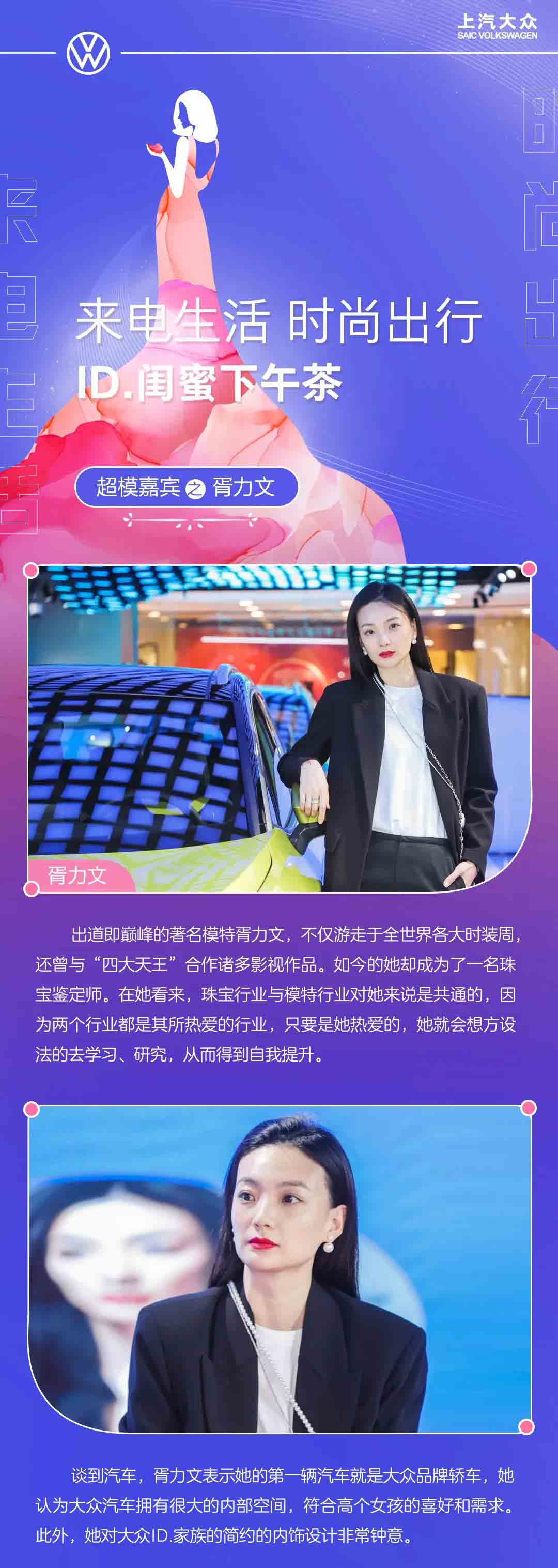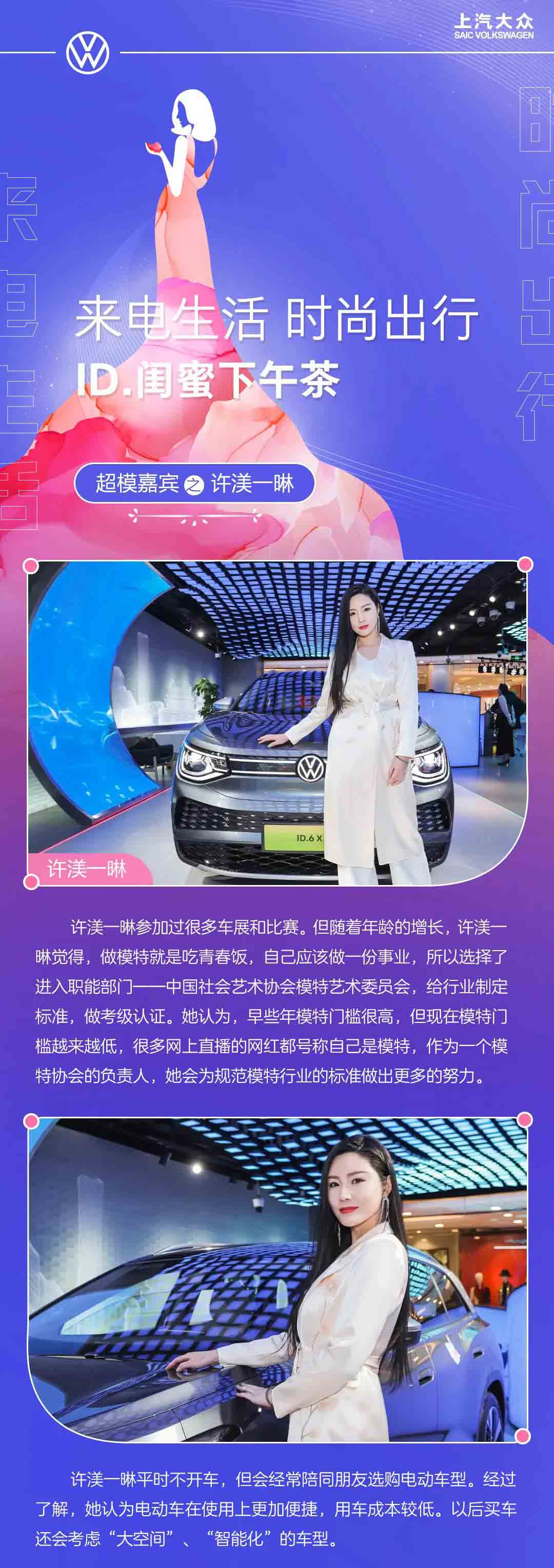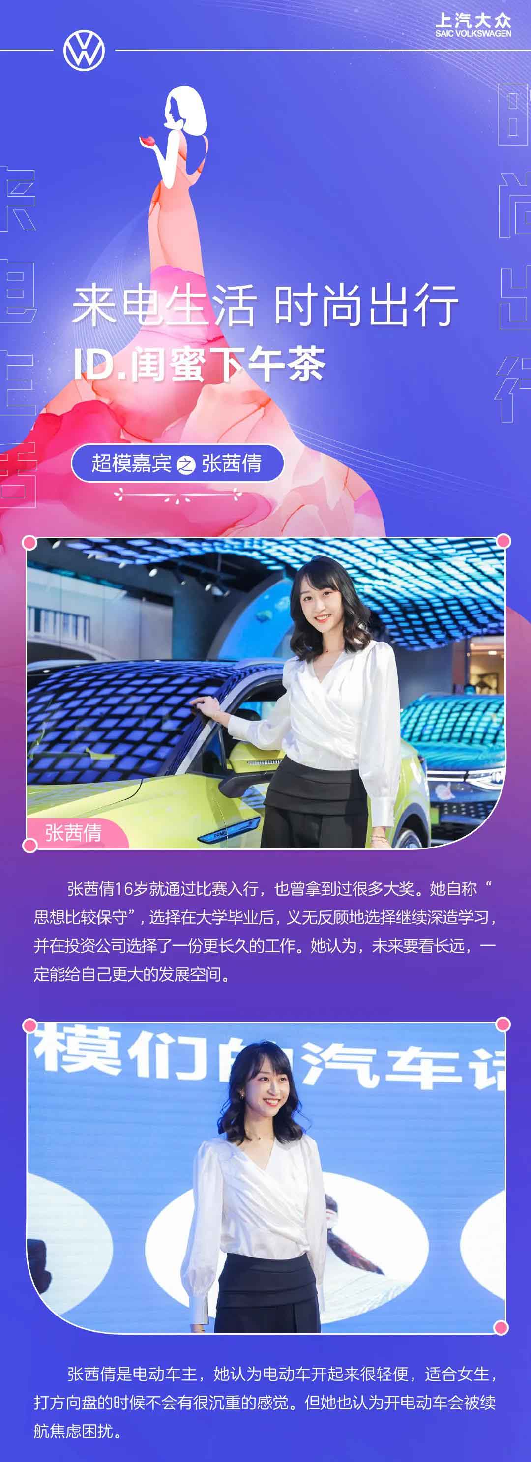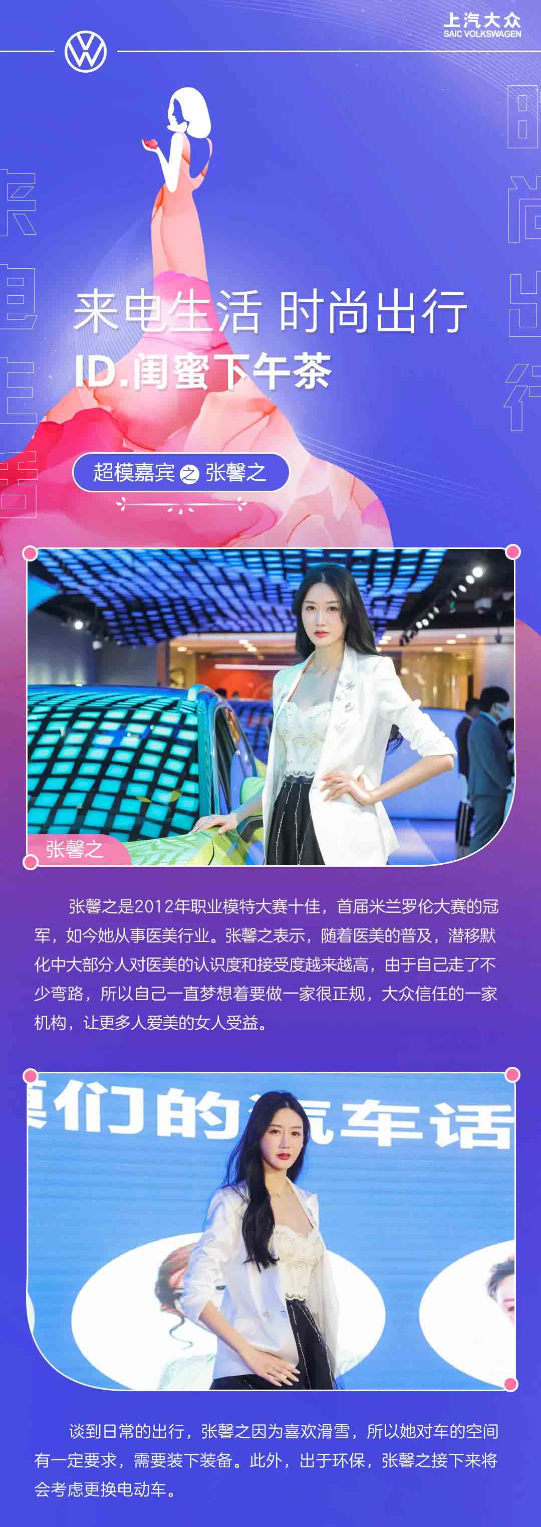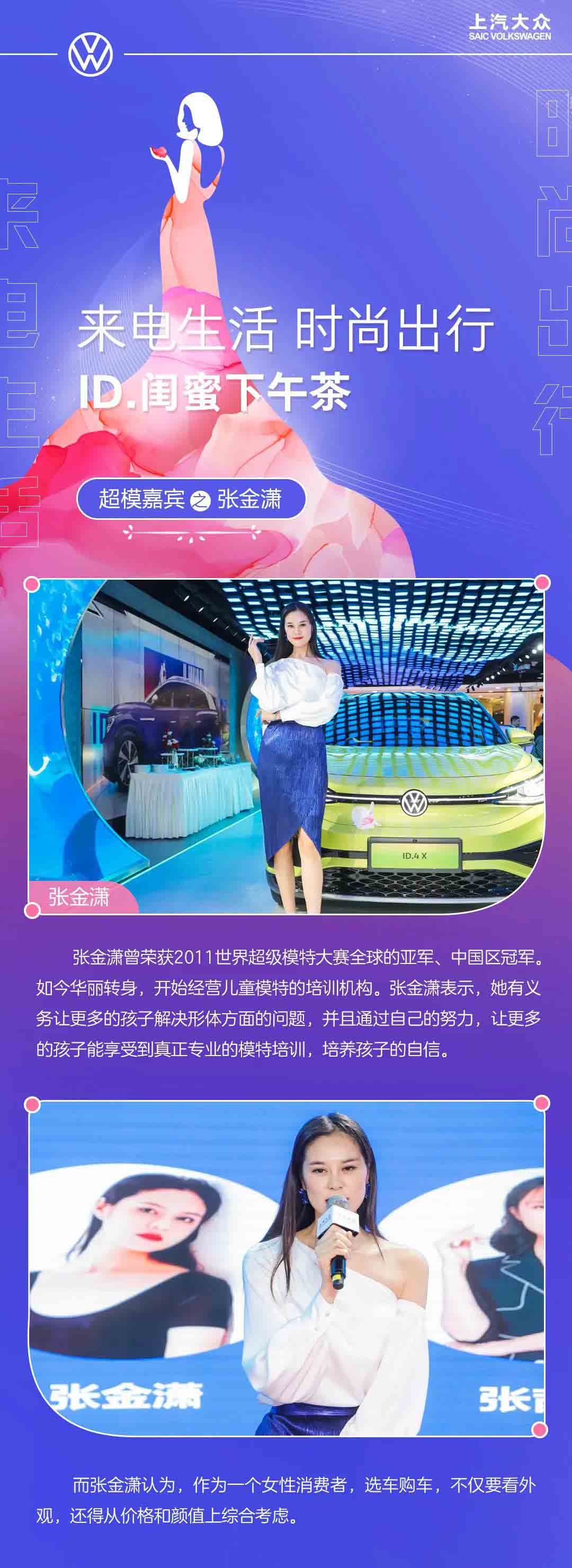 2021年12月29日,由上汽大众主办的“来电生活 时尚出行--ID.闺蜜下午茶”主题沙龙在北京蓝色港湾上汽大众ID.STORE X北京旗舰店举行。著名模特胥力文、张金潇、张茜倩、张馨之、许渼一晽在本次沙龙上分享了自己的转型之路及用车观念。