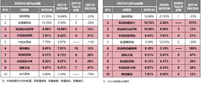 ú Top10问题中,换挡顿挫、发动机噪音大和抖动异常等8个与动力系统相关,其中发动机噪音大和机械故障首次上榜,同比分别增长375%和189%;