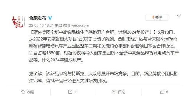 5月10日,“合肥发布”的一则消息曝光了蔚来全新品牌的动态。