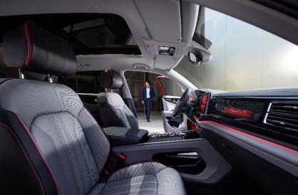 全新途昂X双层悬浮式仪表台的X-ray镭射光束式透光饰条,散发潮流运动风范。仪表台下层为飞翼式造型的软质包裹,搭配缝线设计,表现了极佳视觉效果和豪华感。搭配拨片式数字换挡、哈曼卡顿高级音响,30色格调环境氛围灯,让用户行车途中全方位地被高级豪华质感氛围所围绕。