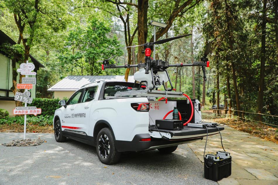 在龚槚钦看来,RD6高达6KW的放电功率,能够在经济成本和节能层面,完美满足农业无人机作业的要求。通过车充无人飞机电池,充满一块电池仅需 0.25 元,相比燃油发电机充电节省约 91% 的成本,同时更加低碳、环保。此外,有了这款纯电皮卡,新农人下地作业更加轻松、舒适。他们不用携带燃油发电机,就能安安静静地充电,还可以坐在车里一边吹空调一边打药。因此,他毫不犹豫的就和雷达签署了战略合作伙伴,采购数台雷达RD6车型充当公司农业无人机作业车。