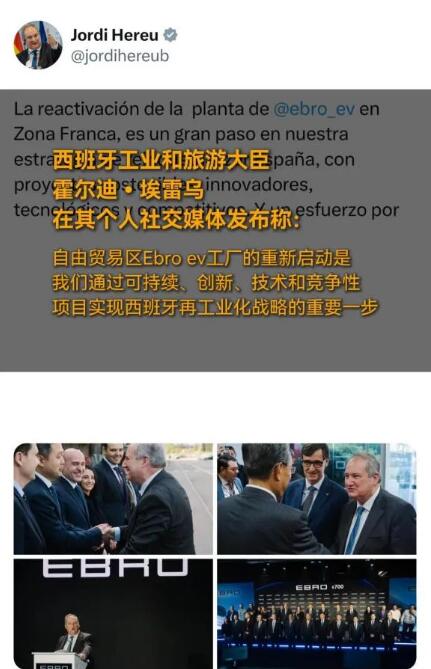 (图为西班牙工业和旅游大臣霍尔迪·埃雷乌个人社交媒体账号截图)