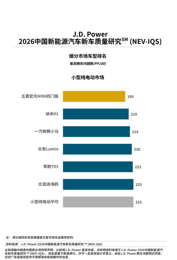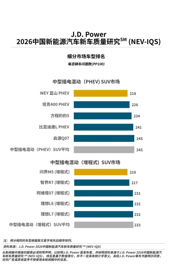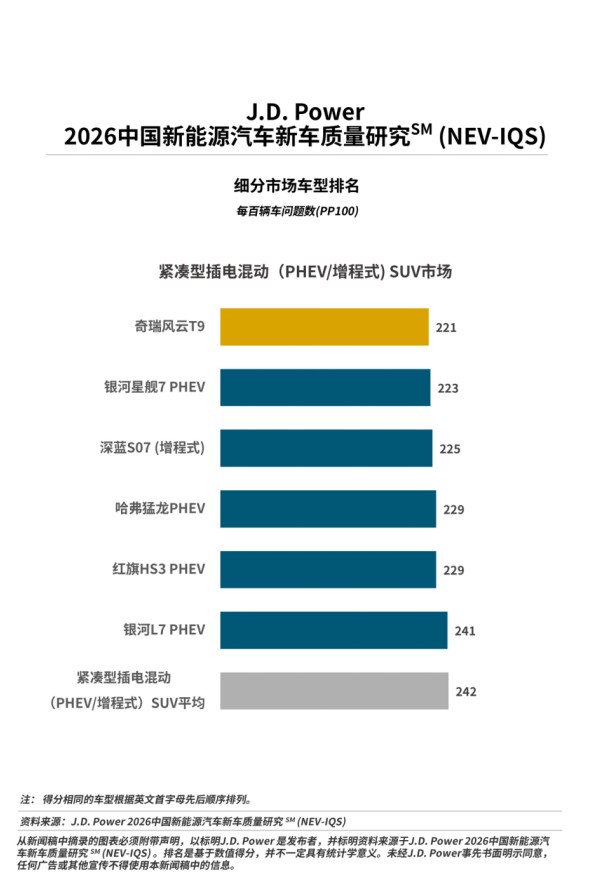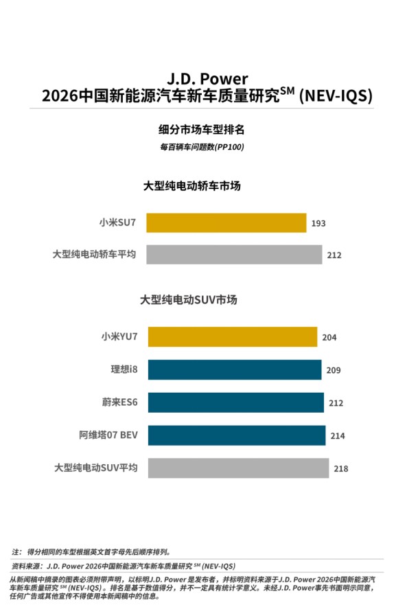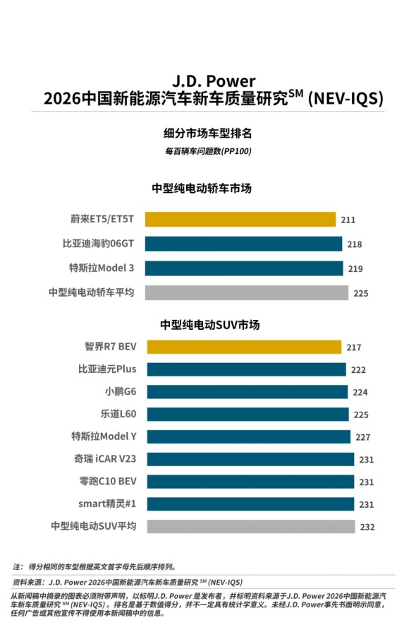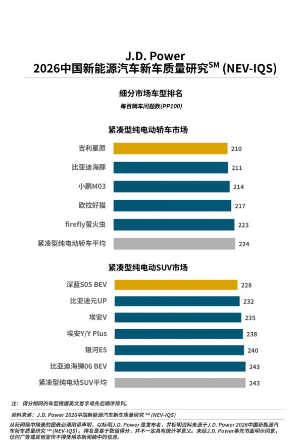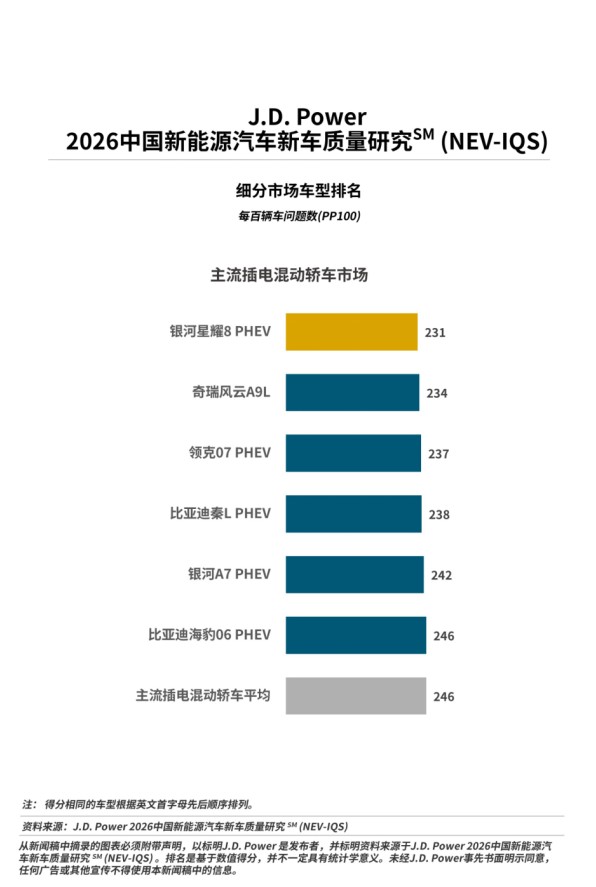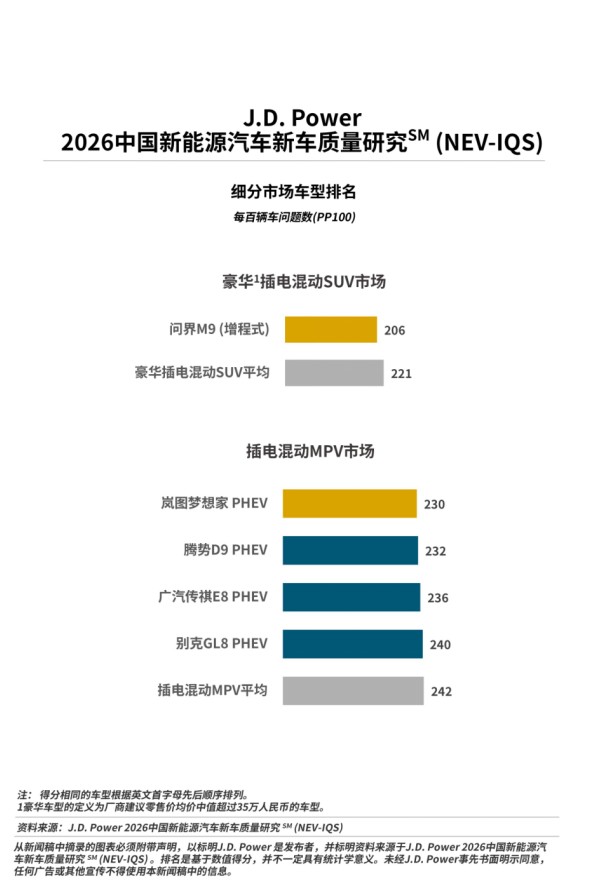 2026年4月2日,上海 — 全球领先的消费者洞察与市场研究机构J.D. Power|君迪 今日正式发布2026中国新能源汽车新车质量研究SM(NEV-IQS),是J.D. Power连续第八年在中国发布这一研究,该研究基于J.D. Power行业通用的新车质量研究IQS体系,并针对新能源车特有问题进行补充,该研究统计和衡量了新能源汽车新车车主在2至6个月的拥车期内遇到的质量问题。新车质量以平均每百辆车问题数(PP100)表达,问题数越低,质量越好。