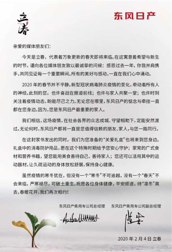 自1月24日起,东风日产陆续向经销商发布《致经销商家人的一封信》、《关于下发东风日产2020新春开工指引的通知》和《齐心协力抗疫情,众志成城一定赢——东风日产致全体经销商家人的一封信》,指引经销商开展工作。