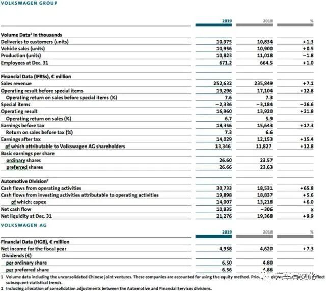 近日,大众汽车集团(下称“大众”)发布了2019年财报业绩报告:全年销售收入达2526亿欧元,同比增长7.1%;未计入特殊项目支出的营业销售回报率为7.6%,略高于2018财年的7.3%回报率。未计入特殊项目支出的营业利润达193亿欧元,同比增长12.8%。