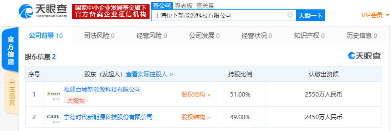据天眼查数据显示,快卜新能源于3月6日正式注册成立,注册资本为5000万元,其中百城新能源出资2550万元,持股比例为51%,宁德时代出资2450万元,持股比例为49%,这家公司的经营范围包括新能源科技、电池科技、停车场(库)经营,新能源汽车充换电设施建设运营等。