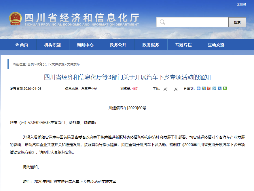 4月7日,四川省经济和信息化厅等3部门联合下发《2020年四川省支持开展汽车下乡专项活动实施方案》,明确支持省内注册登记的汽车生产企业制定汽车下乡市场开拓专项计划。