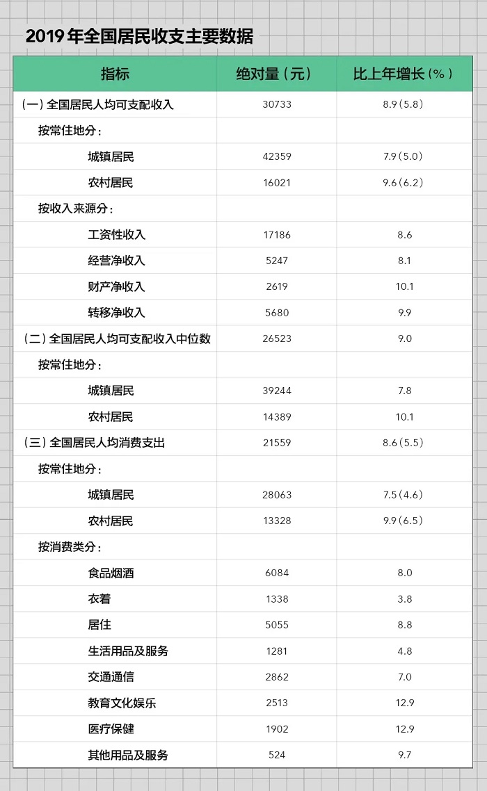 根据国家统计局最新的统计数据显示,2019年,全国居民人均可支配收入30733元,比上年增长8.9%。城镇居民和农村居民人均可支配收入42359元和16021元,分别增长7.9%和9.6%。全国居民人均消费支出21559元比上年增长8.6%,城镇居民和农村居民人均消费支出为28063元和13328元,分别增长7.5%和9.9%。