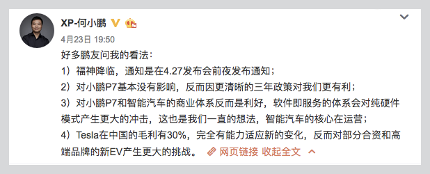 P7(参数|图片)上市发布会之前。小鹏P7有后驱长续航、后驱超长续航及四驱高性能三款车型,预售价格24万-37万元,部分车型在30万元以上,因此,小鹏P7的定价大概率会有所调整。这也是为什么小鹏汽车董事长何小鹏发微博表示“福神降临”。