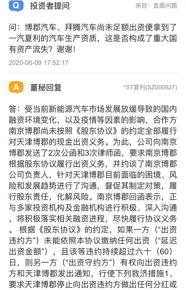 5月26日,*ST夏利回复深交所和股民问询时称,南京博郡至今仅出资现金1400万元,未依照协议缴纳任何出资已超过60天,一汽夏利将有权单方面终止此前双方签订的《股东协议》,并将不排除在天津博郡董事会、股东会无法达成一致的情况下,通过诉讼方式解决南京博郡出资问题。