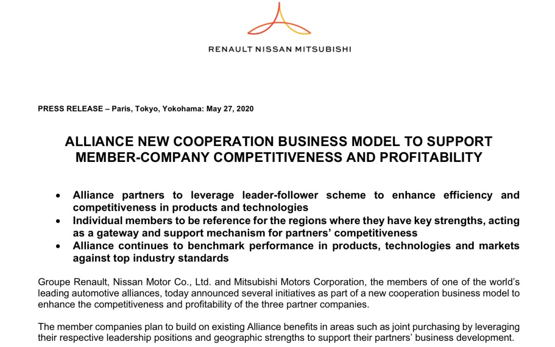 就在5月27日,该联盟内成员的掌门人进行了“云上聚首”。在戈恩“潜逃”、新冠肺炎疫情、车市下行等多重因素的施压之下,雷诺董事长让-多米尼克·盛纳德、日产CEO内田诚、雷诺代理CEO克洛蒂尔德·德尔博斯 以及三菱董事长益子修着手对联盟进行新的战略规划。