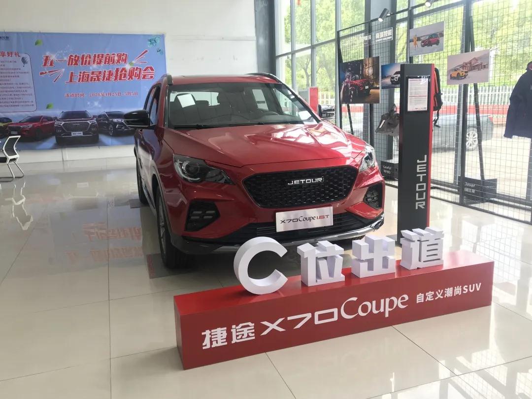 上海晟捷智慧店是一个标准4S店的规模,内部非常整洁干净,店里展车大多是白色的捷途汽车,捷途X70上面搭了帐篷,显示捷途品牌对于旅行+概念的贯穿,大红色的捷途X70 coupe是展厅唯一不同颜色的车型,看起来非常漂亮和不同。