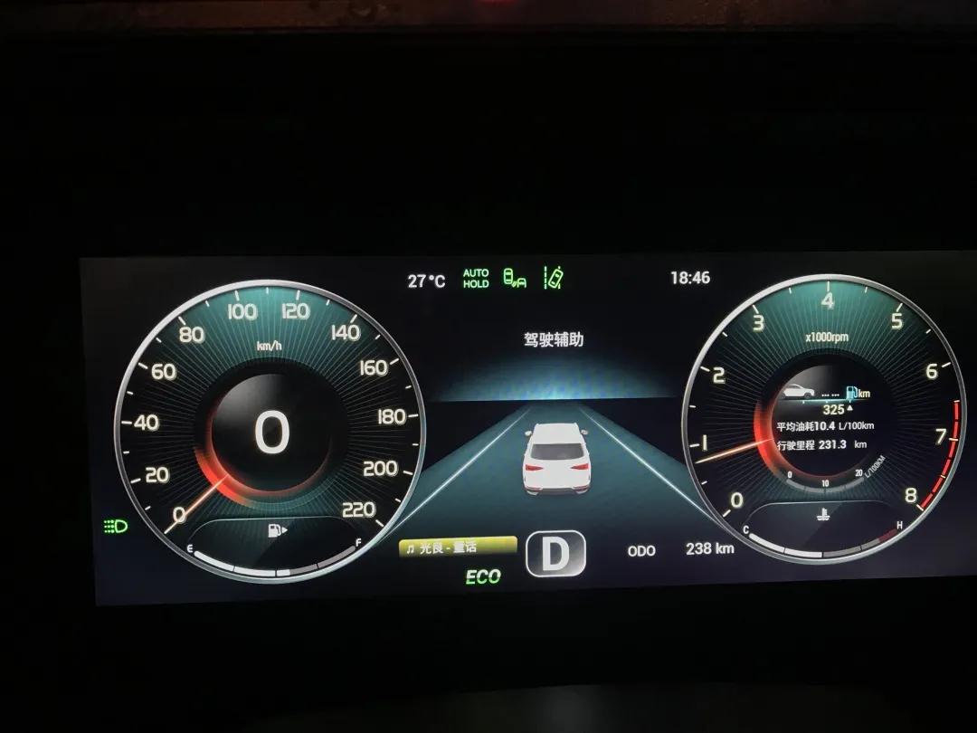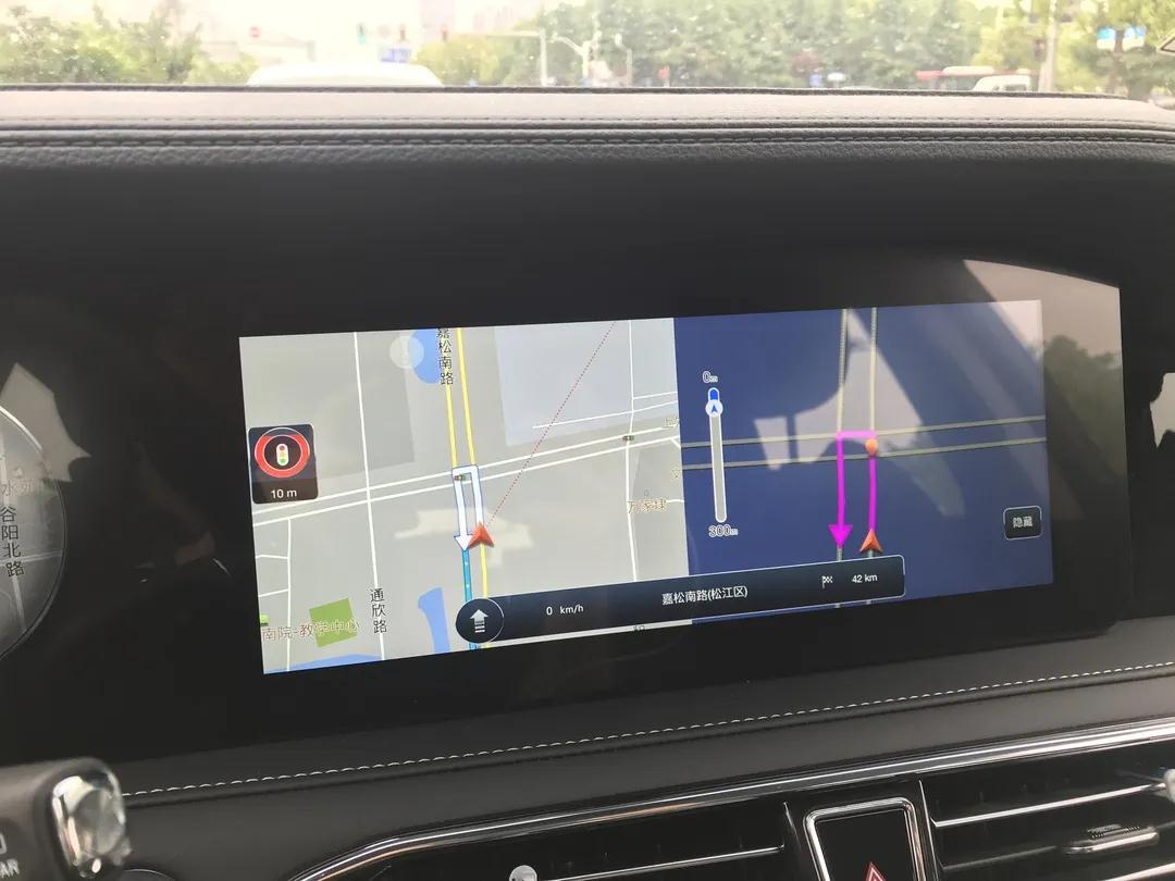 处理完毕这些塑料膜和套,汽车内饰靓丽的本身现露,三块屏幕显示高端大气,方向盘功能丰富,座椅大气舒服,12个音箱加个低音炮的音乐环绕效果满足了耳朵。边开边享受吧,开启发动机,油箱开始红色报警,显示只能跑10公里,导航到附近的嘉松公路加油站,2公里多,心里还是很没底,关掉空调,油门轻踩走起加油去。