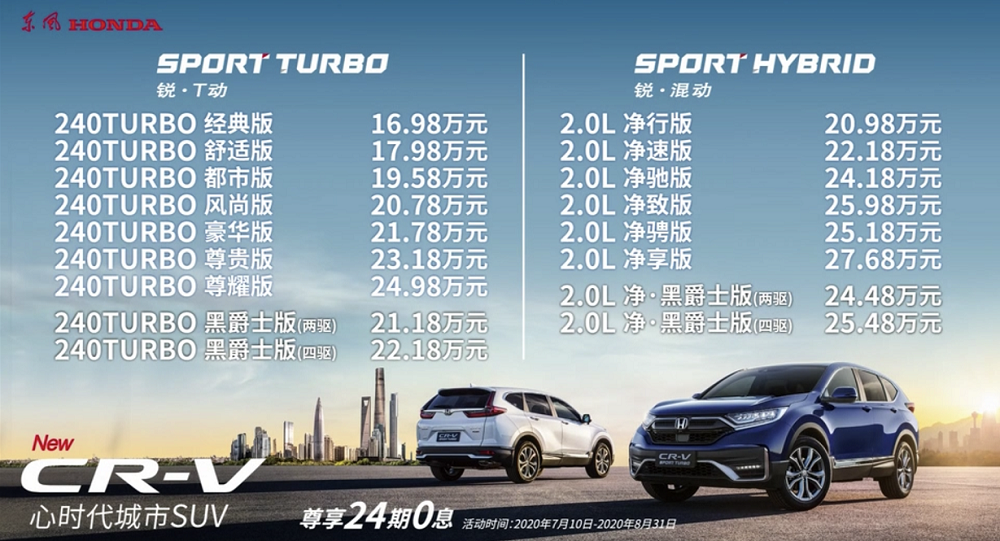 新CR-V共推出锐•T动和锐•混动两种版本共17款车型,市场指导价16.98万元—27.68万元。上市即同步推出礼享款待:尊享24期0息(活动时间:即日起至2020年8月31日)。