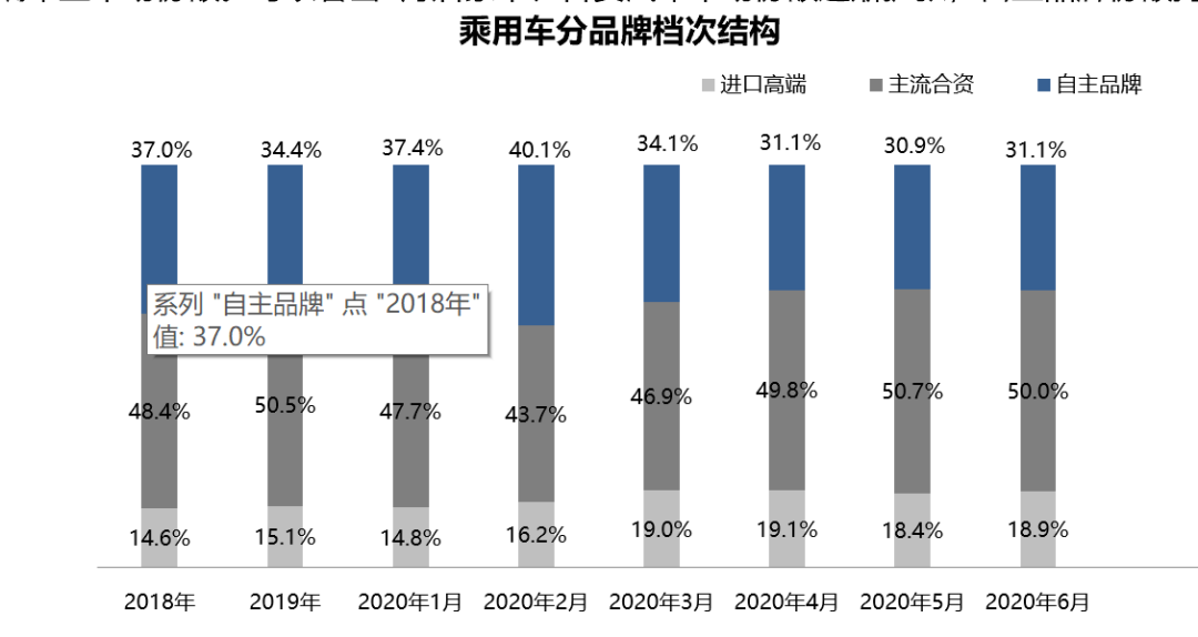 从品牌档次来看,6月进口高端、自主品牌市场份额较上月分别上升0.5%和0.2%,主流合资品牌市场份额较上月下降0.7%。流通协会指出,上半年随着疫情逐渐稳定,消费刺激政策推动汽车市场复苏,而中高端汽车为促进销售多实施以价换量策略,层层下压挤占低端车型市场份额。3月份以后豪华、合资汽车市场份额逐渐扩张,自主品牌份额持续被合资抢夺。