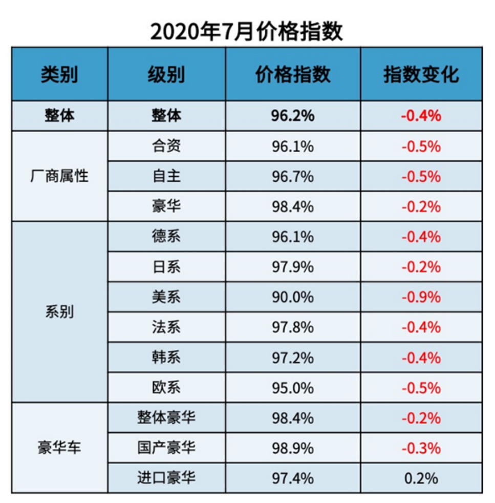 随着国内疫情影响逐渐消退,汽车市场持续恢复,降价促销是车企抢占市场需求重要的途径,价格指数下降趋势明显。根据广州威尔森信息科技有限公司在发布会上发布的《7月市场洞察及价格月报》显示,2020年7月整体汽车市场价格指数为96.2%,环比下降0.4%。