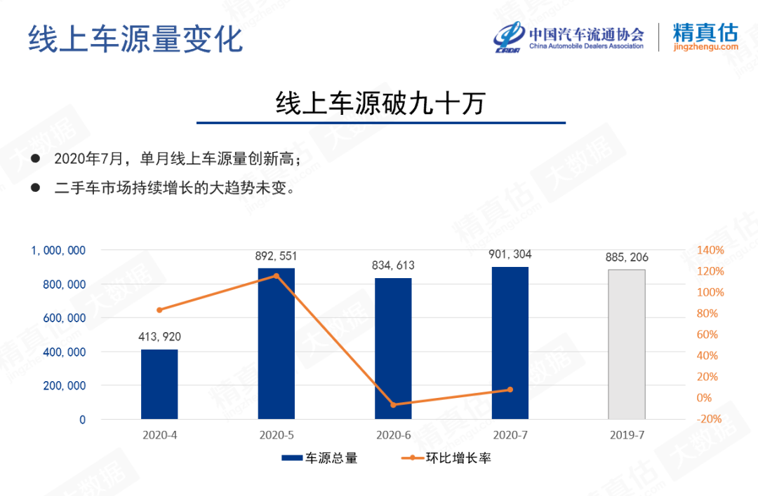 在本次发布会上,精真估发布了《7月中国汽车保值率报告》。数据显示7月二手车线上车源量创新高达九十万辆,原因既有“报复性复工”的因素,也有疫情影响原来的线下车源逐步转向线上的原因。总体来说,7月份各细分车型的保值率比较稳定,MPV和中大型SUV价格涨幅较大。