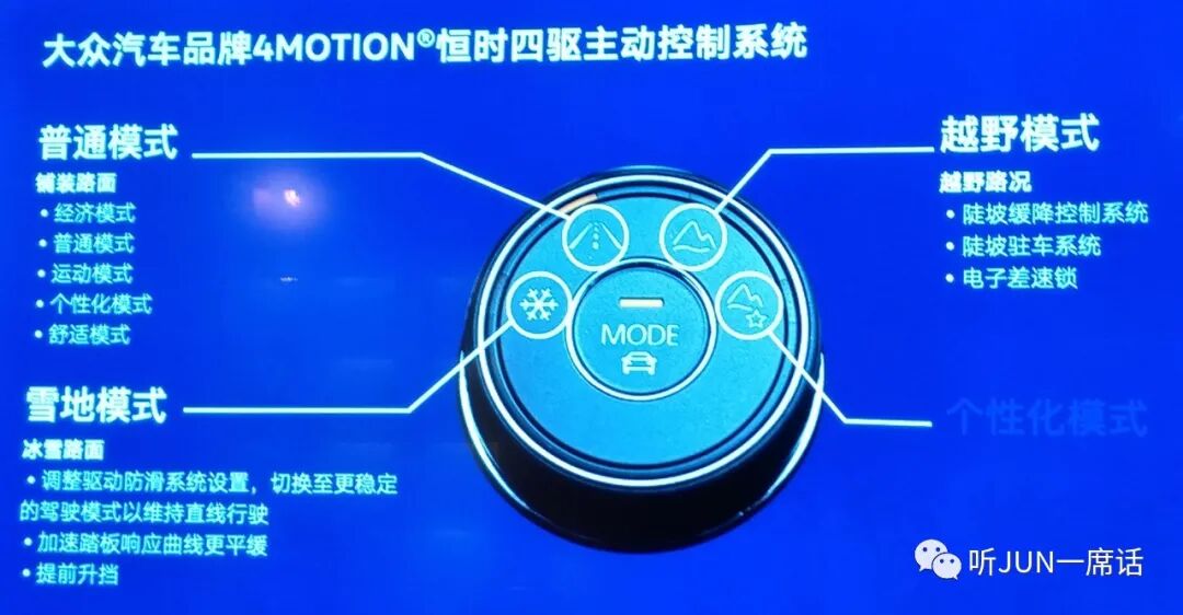大众汽车品牌SUV还装有4MOTION®恒时四驱主动控制系统,包括普通模式、越野模式、雪地模式、个性化模式。通过个性化设置,可以调节转向助力的轻重、悬挂的舒适度、底盘的高度等等。