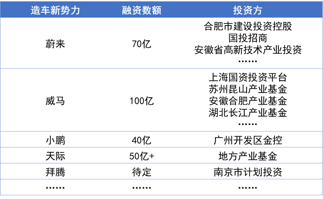“天际汽车完成地方政府产业引导基金领投的50亿元人民币融资;小鹏汽车获得广州开发区40亿融资;威马汽车完成由上海国投领投的100亿元融资……”